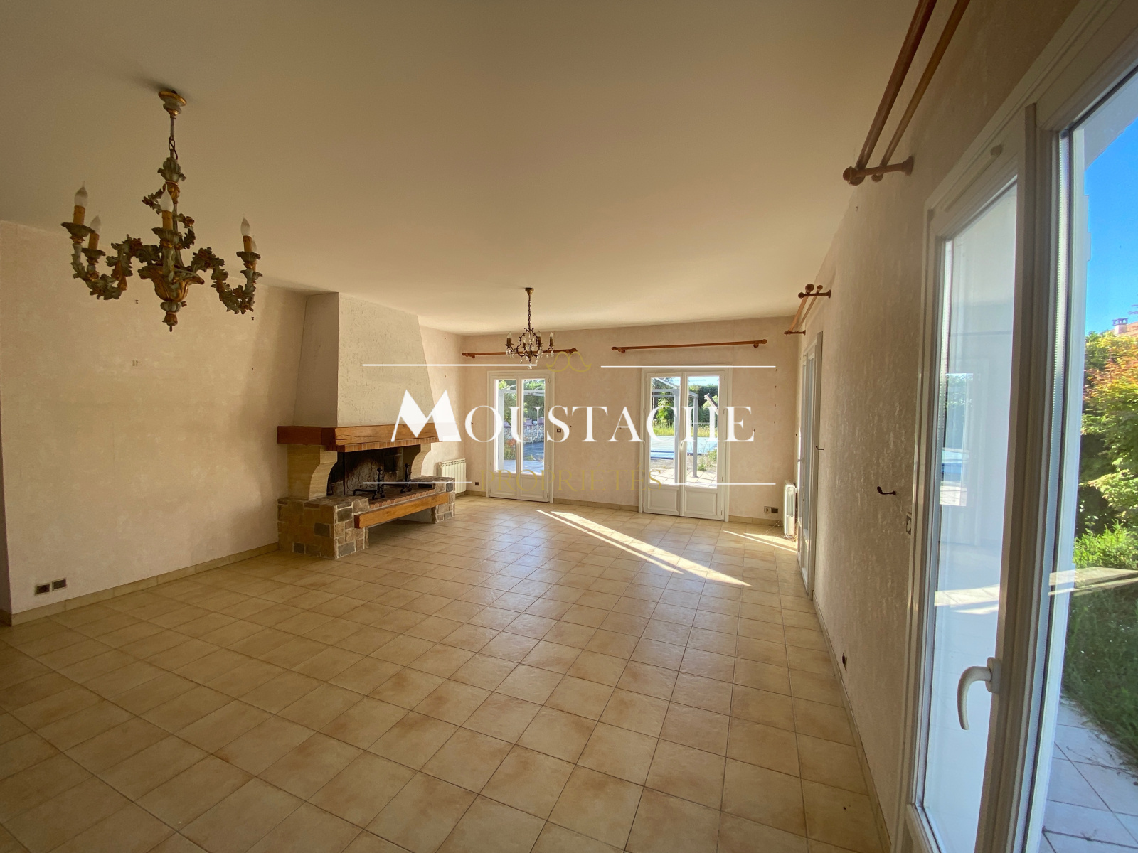 une vaste piéce de vie de 50m2 trés lumineuse avec son élégante cheminée, ouvrant sur le jardin et sa piscine,