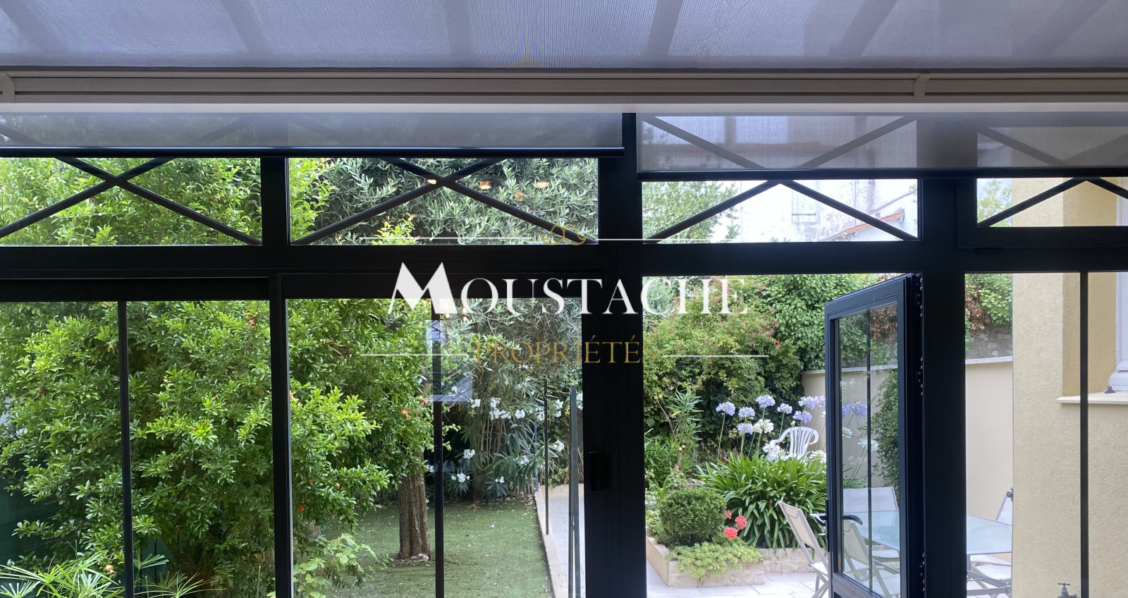 Véranda en alu bien exposée d'environ 20m2 donnant sur le jardin,